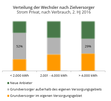 Rund 45 Prozent der Geringverbraucher, die weniger als 2.000 kWh Strom pro Jahr verbrauchen, verlassen beim Versorgerwechsel den lokalen Grundversorger. Bei den Großverbrauchern sind es dagegen weniger als ein Drittel. 52 Prozent der Geringverbraucher wechseln aber anschließend zu anderen Grundversorgern in deren externen Vertriebsgebieten, während es bei Großverbrauchern mit mehr als 4.000 kWh Jahresverbrauch nur 29 Prozent sind. Dies geht aus der aktuellen Ausgabe der Wechslerstudie Energie 2. HJ 2016 hervor, die als Schwerpunktthema den Zusammenhang zwischen der Höhe des jährlichen Strom- und Gasverbrauchs und dem Wechselverhalten der Verbraucher untersucht.