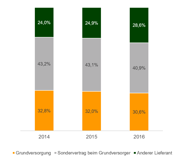 Das steigende Wechselaufkommen hat vor allem im Strommarkt zu einem deutlichen Rückgang der Kundenzahlen der Grundversorger geführt. So fiel der Anteil der Kunden, die noch im Rahmen der Grundversorgung beliefert werden um 1,4 Prozentpunkte auf 30,6% und der Anteil der Kunden, die vom Grundversorger außerhalb von Grundversorgungsverträgen beliefert werden, um 2,2 Prozentpunkte auf 40,9%. Im Gegensatz dazu hat der Anteil der Haushaltskunden, die von einem anderen Unternehmen als dem Grundversorger beliefert werden, um 3,7 Prozentpunkte zugenommen und beträgt nun 28,6 Prozent.